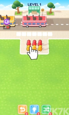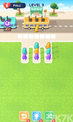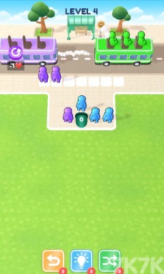 将和公交车一样颜色的小人放到公交车中,这样就可以完成小人消除。尽量不要让公交车出行空余位置,提高通过率。更少的时间和更少的步骤就可以有更高的分数,后期关卡会出现隐藏小人,需要更好进行排序上车,快来挑战吧!